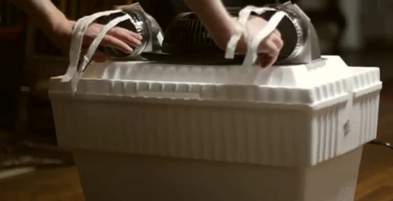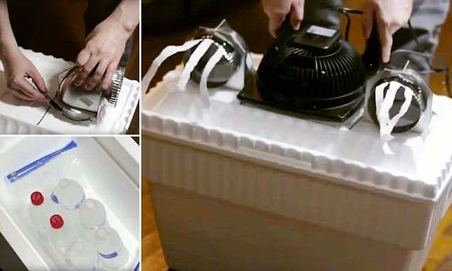 新空调的主体将是一个泡沫聚苯乙烯盒,可以以4美元左右的价格购买。两个用于放空的空气通风孔每块价格2美元,您还需要一个风扇躺在周围。这种惊人的空调可以仅在这三件事的帮助下制成。现在,您要做的就是追踪供以后切割目的的泡沫聚苯乙烯扇上的通风口区域和风扇。尽量准确。然后,您切断了这些泡沫塑料区域,并在真空吸尘器的帮助下摆脱了泡沫。首先,您连接通风孔,然后可以连接风扇并进行一些空气流程测试。如果空气有效地出来,则开口就可以了。如果它泄漏或不足,则需要在胶带的帮助下打几个孔,甚至可以关闭一些孔。如果您的风扇处于较弱的一面,请仅放置一个通风孔。