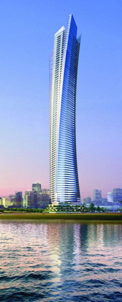该塔由AEDAS的Andrew Bromberg设计,由Damac开发。当地面工程和堆积开始在现场海洋高地时,将是一栋50层的建筑。但是,当开发商看到较高的建筑物在码头获得计划许可时,他们开始思考更高。达马克(Damac)给了建筑师两个星期,以生产72楼,60,000平方米的塔式设计。然后他们说,他们希望一栋82层的建筑高到310米,并希望其设计在一周内完成,因为他们已经将公寓卖掉了。
