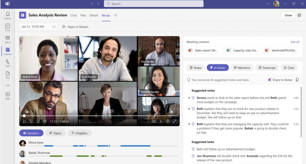智能回顾使用OpenAI gpt - 3.5模型生成会议笔记,并强调即使你没有。每个演讲者的贡献突出显示在一个时间轴的主题和章节,用笔记,提到,一个完整的记录。如果一个同事提到你在开会,你会得到个性化的时间标记,这样你就可以很快知道。