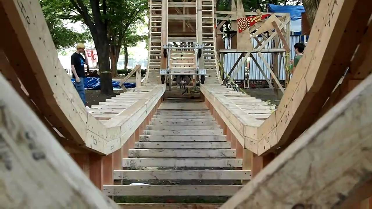 麻省理工学院的学生在盛大的庆祝活动中创建了一个木制过山车,并被命名为East Campus Roller Coaster。在学习工程学的学生中,特技已成为一种传统。邀请新生骑行,并被绑在一个小越野车中。