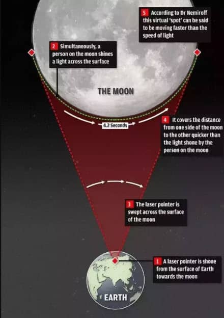 想象一下,你有一个手电筒或激光指向月亮,你迅速将它移动到另一个天体。从理论上讲,这就相当于一束光从月球到这个物体的距离,比如说,在几秒钟内,使光束的传播速度比光还要快。如果手电筒是一个激光或只是一个普通的手电筒,关键是“没有任何物质物体”以这种速度移动。还要注意,激光是一种特殊的光。