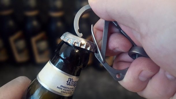关键承载装置是非常类似于关键戒指我们习惯于看到,但它有一个内置的开瓶器。它使用一个carabiner-style夹一端连接更大的Linx环上裤子,一袋,或其他任何你想要争论的关键。