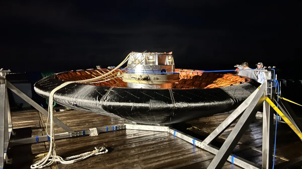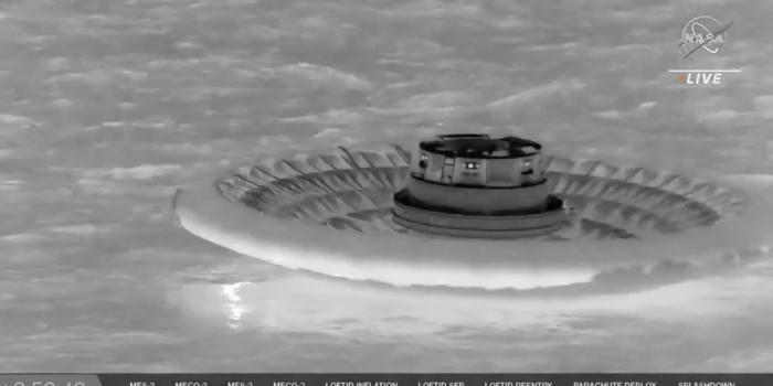 美国宇航局的视频所示,一个降落伞减速伞降低到水。