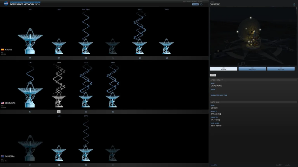 由Advanced Space领导的任务人员于7月6日上午9:26与Capstone(PDT上午6:26)联系。该信号表明,正如7月4日与Capstone的第一次互动中的数据所预测的,Capstone处于预期位置。美国东部时间上午10:18,团队开始恢复工作并从航天器接收了遥测数据(PDT上午7:18)。
