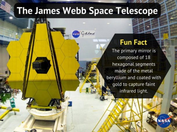 詹姆斯韦伯太空望远镜是由18个六角形的镜子,每一个都是镀金的。它有100次的观察能力比著名的哈勃望远镜。美国宇航局局长查理•博尔登说“韦伯,建成后将成为最大和最复杂的空间天文台,任何人都地球上有史以来建造的最大的。它将捕获数百万人的想象和梦想敢于看看天空和奇迹。”它将于2018年10月,将定位月球的轨道之外。因此,它会有一个完全通畅的观点虽然它漂浮到外太空。
