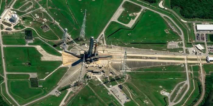 美国宇航局的月球太空发射系统(SLS)巨型火箭上周已被转移到肯尼迪航天中心的发射台,准备进行测试。卫星图像显示了这枚火箭的巨大尺寸。