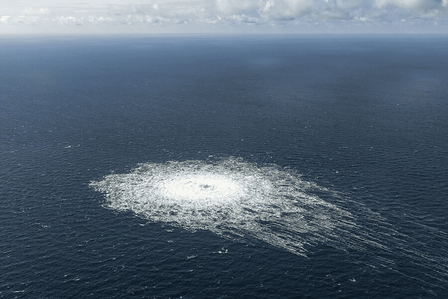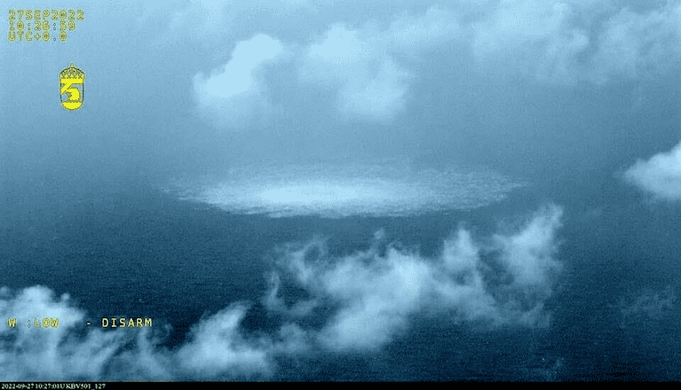 一系列奇怪的泄漏后在两个天然气管道从俄罗斯在波罗的海到德国,一个巨大的扰动在海里可以看到丹麦博恩霍尔姆岛的海岸周二,9月27日,2022年,提高担心怀疑破坏。在发现三个泄漏Nord Stream 1和2,丹麦首相Mette Frederiksen说她“不能排除”破坏。