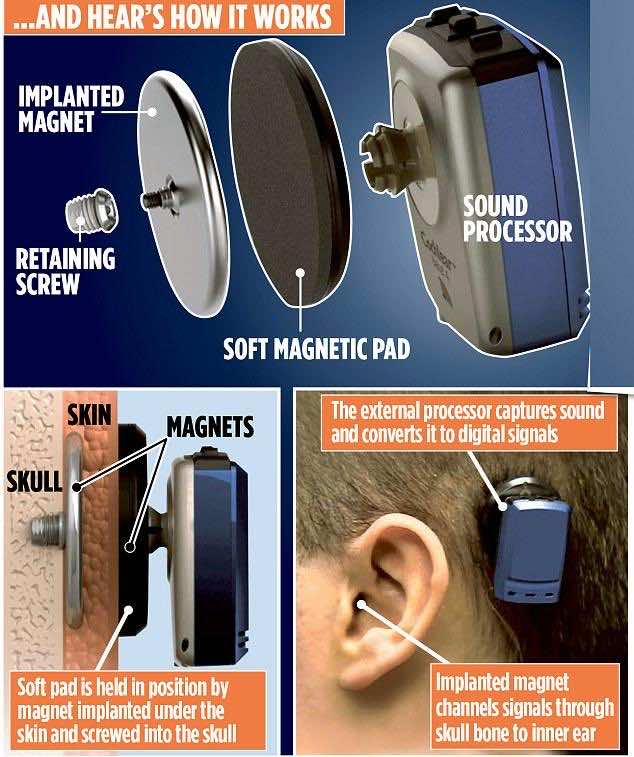 在全身麻醉的情况下,植入手术需要40分钟。在耳后钻一个2英寸深、半英寸深的洞。皮肤在两周内就会愈合,而用螺丝钉固定骨头则需要大约一个月。这一阶段过后,患者就可以安全使用接收器了。