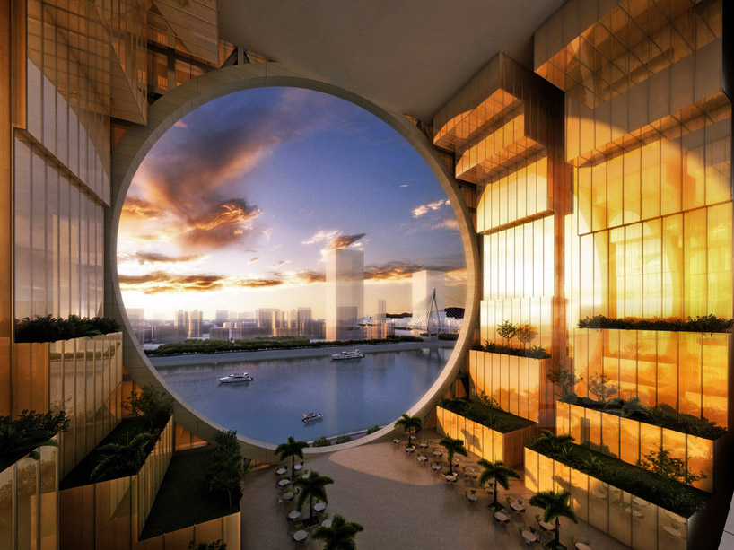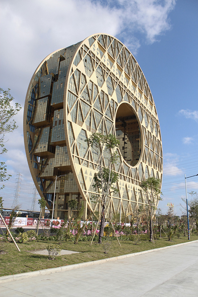 该建筑物覆盖了85,000平方米的地板空间,高452英尺,高度为33楼。建筑物中存在的圆形孔的直径为157英尺。到目前为止,该建筑物正在运动广东塑料交换,酒店和其他一些办公室。这座豪宅的想法不是从甜甜圈中启发而来的,而是具有更多的“传统”价值。根据设计师的说法,他们的灵感来自被认为在中国有价值的玉盘以及源自风水的命理传统。