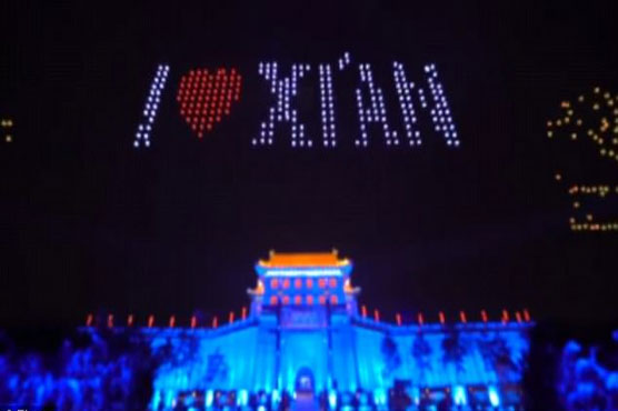 无人机形成16个不同的3D图像。为了纪念Xi'an的13.74公里墙,无人机从中驾驶飞机的13.74公里墙。一些无人机破裂了,在演出结束时就落在了地面上。