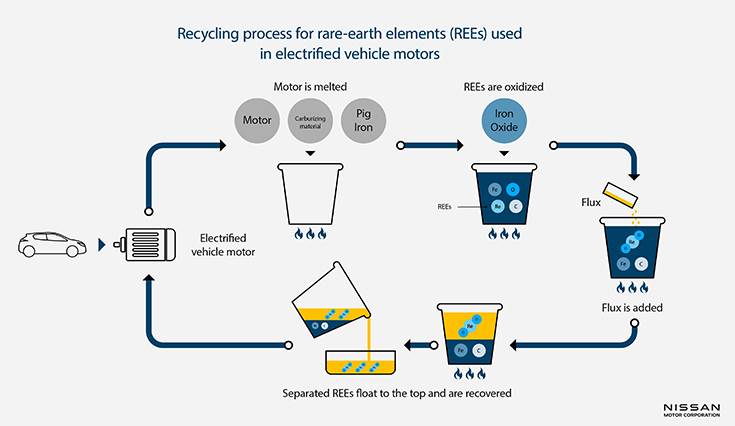 使用钕和镝等稀土元素的电动机自然具有磁力。在这项新技术中,日产汽车采爱游戏ayx体育用干式精炼技术,将转子在1.400摄氏度的高温下熔化,以氧化液体的形式提取出来,然后将其分解到稀有土壤中提取稀土。