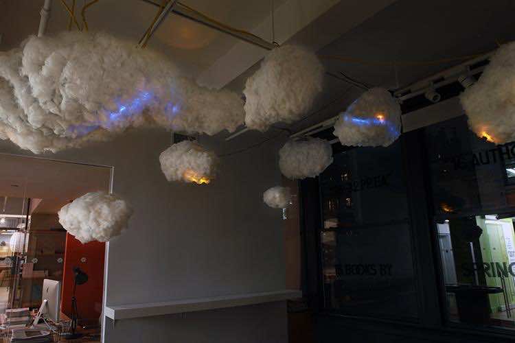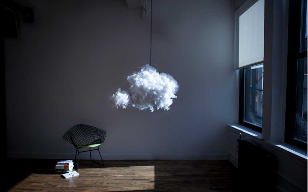 “云”的制造采用了低致敏性纤维填充物,将其粘在海绵制成的外壳上,以形成“框架”。框架内的照明设置和扬声器,赋予一个真正的感觉雷雨云云灯挂在你的天花板。