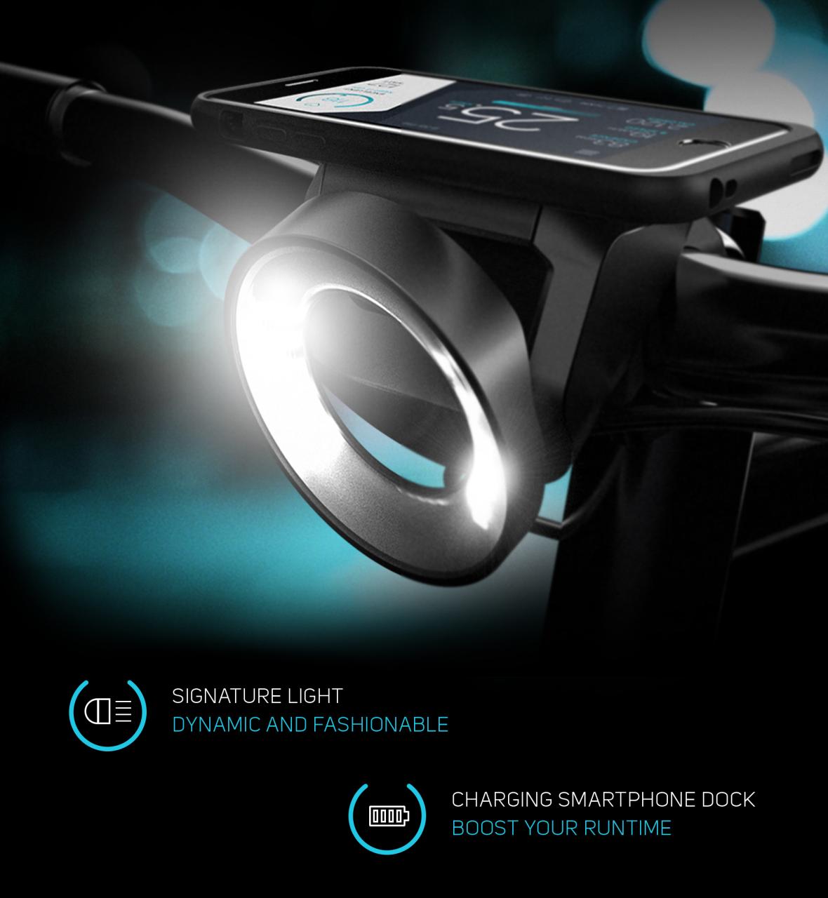 一家名为iCradle的德国初创公司开发了COBI系统,这是一种将传统自行车转变为智能自行车的创新方式。该系统利用用户的智能手机来运行配套的应用程序,同时手机被放置在一个固定在车把上的IPX6防水底座上。轮毂还设有一个LED大灯(最大。输出25勒克斯在33英尺),加速度计,高度计,气压计,环境光传感器和一个电喇叭。