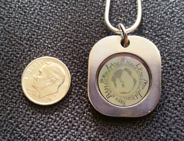 如果你有兴趣把磁盘戴在你的脖子上,Long Now基金会提供了一个坠子大小的罗塞塔可穿戴磁盘。这会让你付出代价我们1000美元,但它被认为是“对项目的捐赠”。