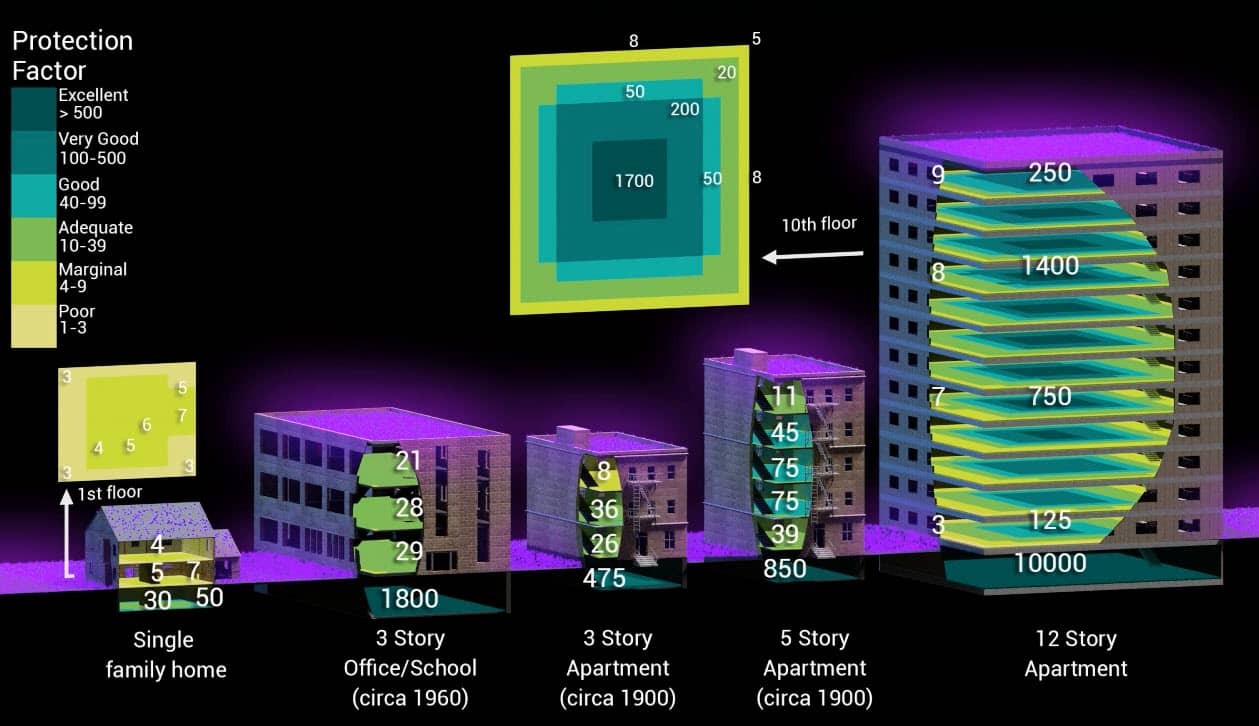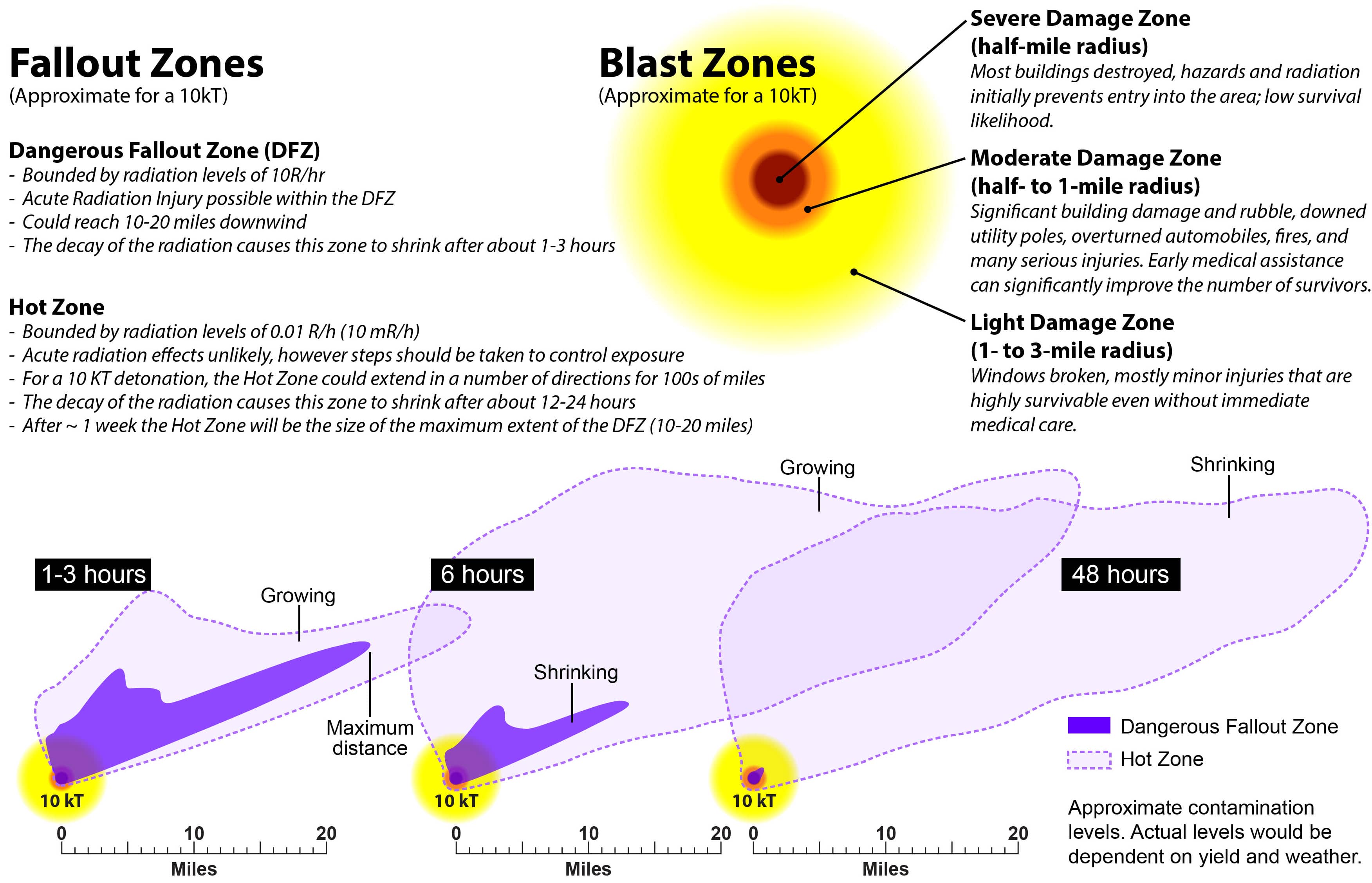 逃离辐射的唯一方法是穿过极密的材料,比如几英尺厚的泥土或几英寸厚的铅。“这些裂变产物与从火球吸入大气层的灰尘和碎片混合在一起。这些粒子发出的穿透性伽马辐射才是危险所在。”