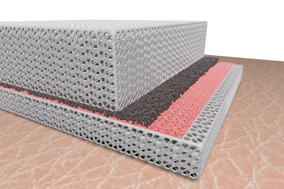 这种新材料是由塑料(聚乙烯)的一种形式,碳和铜。碳包覆层在外面当你试图冷静下来,热量又会辐射出去,产生冷却效果。当外面变冷,你把里面的材料和镀铜在外面有助于保持热量通过创建一个绝缘效果,瞬间温暖你。双面材料可以扩大范围的舒适温度11.5度,这是相当大的温度范围内。