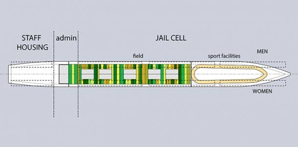 两个帆长350米,高100米。监狱区域分布在前面9平方米的一排排牢房中,而在后面,是院长办公室、行政部门,中间是一个食堂,36平方米的复式公寓供狱警使用。上层甲板专门用于农业,在船头是一个运动场。这艘船是完全自主的,在货物中设有海水处理厂、车间和健身房。