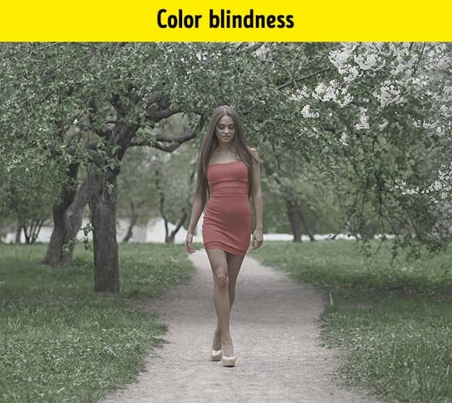 有许多形式的色盲,和视觉上不同类型的类型。其中最常见的是绿色弱视,绿色和红色的颜色失去饱和。在一些其他形式,他们可能无法区分一些颜色。