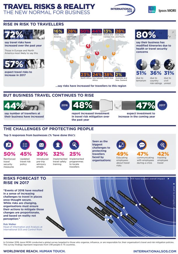 “ 2016年的事件导致一旦被认为是安全的旅行挑战的感觉。尽管风险正在发生变化,但组织必须确保其减轻这些变化的行动是相称的,并且基于现实而不是感知。医疗保健提供和道路安全等问题占我们过去一年中提供的援助服务的70%以上,通常会被更突出但可能更少的问题所掩盖。随着许多组织提高其商务旅行活动,决策者必须能够向包括实际危机在内的人民传达客观建议。”