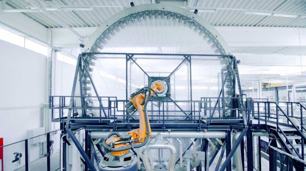 碳纤维增强塑料制成机器制造轮子看起来像一个巨大的摩天轮,可以编织18公里的碳纤维形成主体体的轮子。这项技术爱游戏ayx体育是为了优化驱动,但它有一个价格为18000美元。