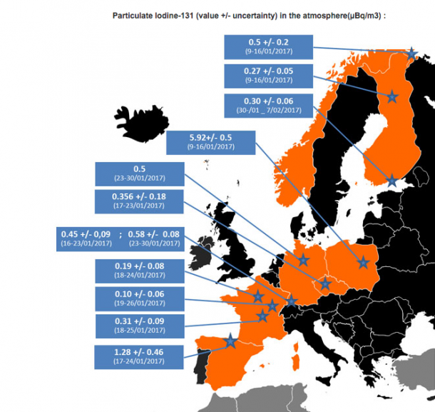 在一月份的第二周,在挪威北部发现了一些碘131痕迹。从那时起,这些颗粒在整个欧洲都移动了,包括芬兰,波兰,捷克共和国,德国,法国和西班牙。Svanhovd的空中滤清器首先进行了观察,该观察距离挪威俄罗斯边境仅一百米,到达科拉半岛。