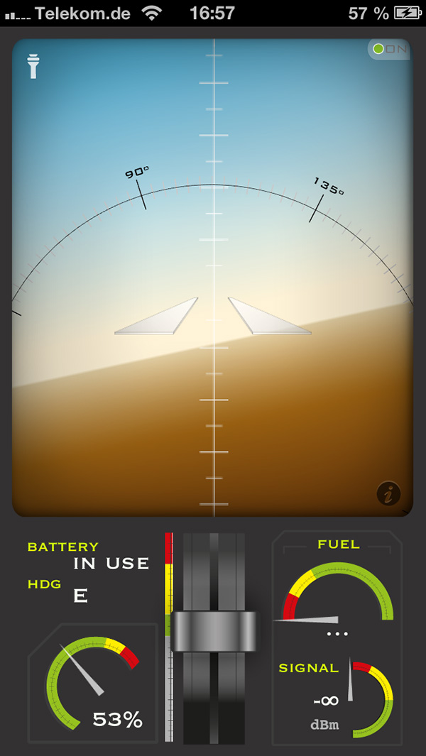 没有相机连接到飞机所以,不,你不会得到一个视频。然而,用户将提供一个人工地平线以及节流控制和其他一些指标显示信号强度和电池寿命。我们聪明的舵面将校准iOS设备的陀螺。