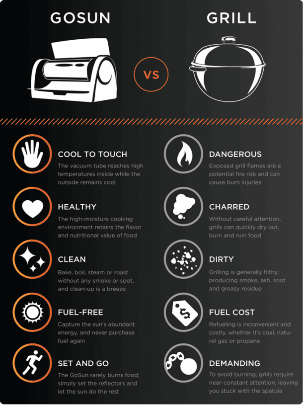 “ Gosun Grill”是一种革命性的烹饪设备,可以使用太阳能烘烤,烤,蒸汽和油炸任何东西!烤架一次可以一次烹饪食物多达8人,其最先进的太阳能真空管可以吸收阳光,并充当绝缘体,以升高温度高达500°F(260°C),即使在烹饪太阳使用其热电池技术降落。爱游戏ayx体育创建者声称烤架可以在10分钟内尽快烹饪一顿饭,但是时间可能会根据食物和条件而有所不同