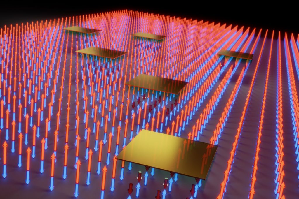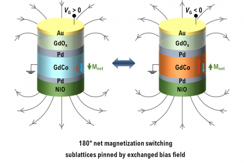 的磁化钆(红色)和钴(蓝色)原子通过箭头所示。当电压电极(黄色补丁),氢是加载在磁性材料,这改变了相对磁化强度,扭转总磁场的方向。