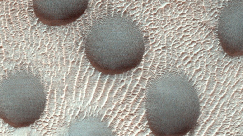 MRO航天器的高分辨率成像实验(HiRise)彩色相机捕捉到了许多沙丘,包括常见的新月形沙丘。然而,这张照片中的沙丘是独特的圆形。