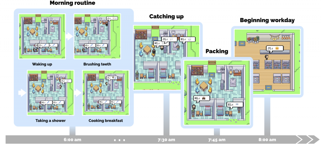 实验涉及创建25 ChatGPT实例,每个代表一个人在一个虚构的小镇。每个代理是促使他们代表的人的信息,然后被要求回应他们的下一个动作的时间和环境。例如,如果约翰代理是提示的信息,它是8点,他就醒来,他会刷牙,吻他的妻子,穿好衣服,去厨房。同样,代理代表约翰的儿子,艾迪,也起床,刷牙,去了厨房。