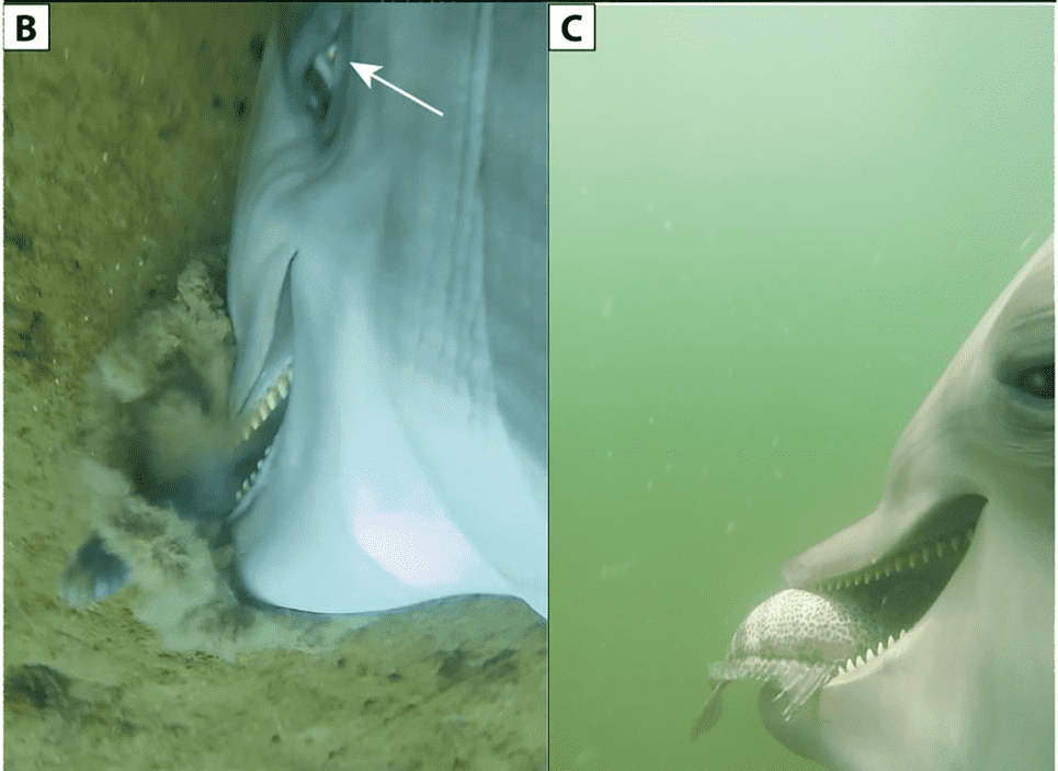 研究人员写道:“即使他们进入海豚嘴,鱼也继续逃脱游泳,但海豚似乎直接吸了鱼。”他们将这一过程归因于一种喂食鲸鱼和其他海洋哺乳动物使用的方法,在这种方法中,捕食者将其喉咙膨胀以从字面上吸收猎物。