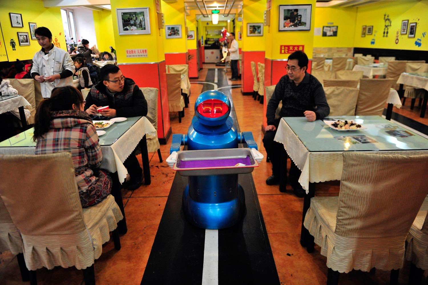 还有另一家提供饺子和面条的机器人餐厅,这些餐厅已经由机器人烹制,自从它在海伦吉安根省哈尔林(Harbin)运营以来,它已经持续了一年多。Usher机器人通过扩展机械手臂并说出客户来迎接客户;‘地球人你好。欢迎来到机器人餐厅。’机器人服务员沿着绘画到地板上的曲目,以便从厨房的桌子上运送食物。这些菜是由机器人厨师爵士准备的。餐厅甚至有一个唱歌的机器人。