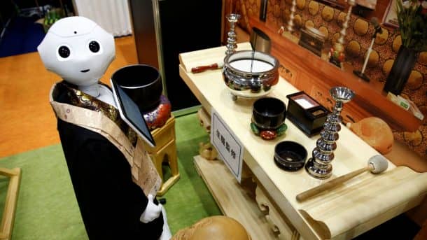The Japanese company, SoftBank’s humanoid robot, Pepper, has a brand new role. It is now a Buddhist priest for hire at funerals. The robot taps a drum and chants mantras in a computerized voice. It was displayed at a funeral industry fair, The Life-Ending Industry Expo, in Tokyo.