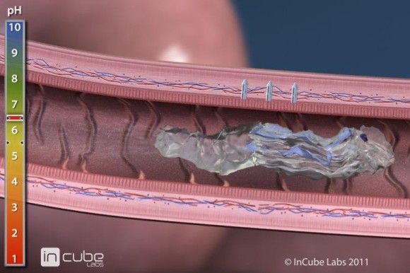 药片的功能是由体内的消化过程激活的。一旦药片到达肠道,pH值就会急剧上升,这就会溶解药片的外层,使之前分离的化学物质如碳酸氢钠和柠檬酸得以混合。这种反应会产生二氧化碳,在药片周围产生一个气泡。针状碳水化合物穿透肠壁,安全释放药物。