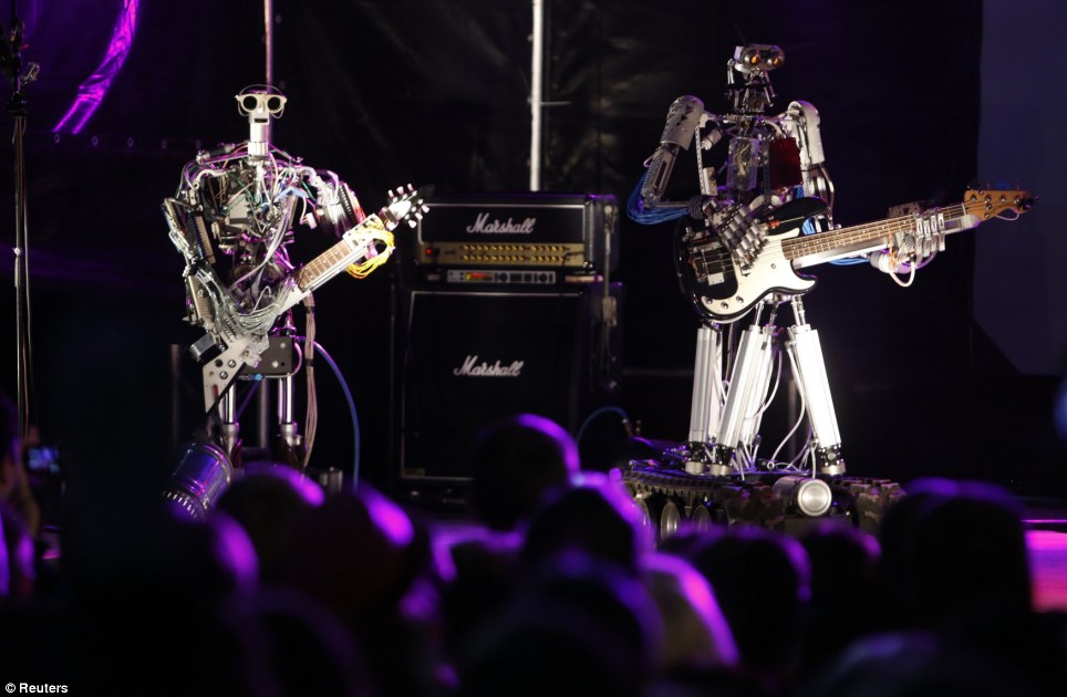 德国金属乐队由三个5英尺高的机器人组成,他们在Artplay Design Center的机器人球展览会上摇摆不定,并惊讶于莫斯科的人群。