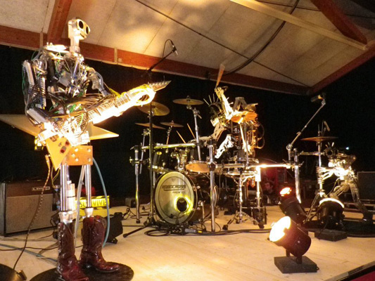 世界上唯一的机器人带的成员是四臂鼓手,Stickboy,Bass Player Bones和79位具有数码的吉他手Fingers。这些机器人都是由废料制成的,由电动气动器控制,并使用MIDI信号使音乐发生。