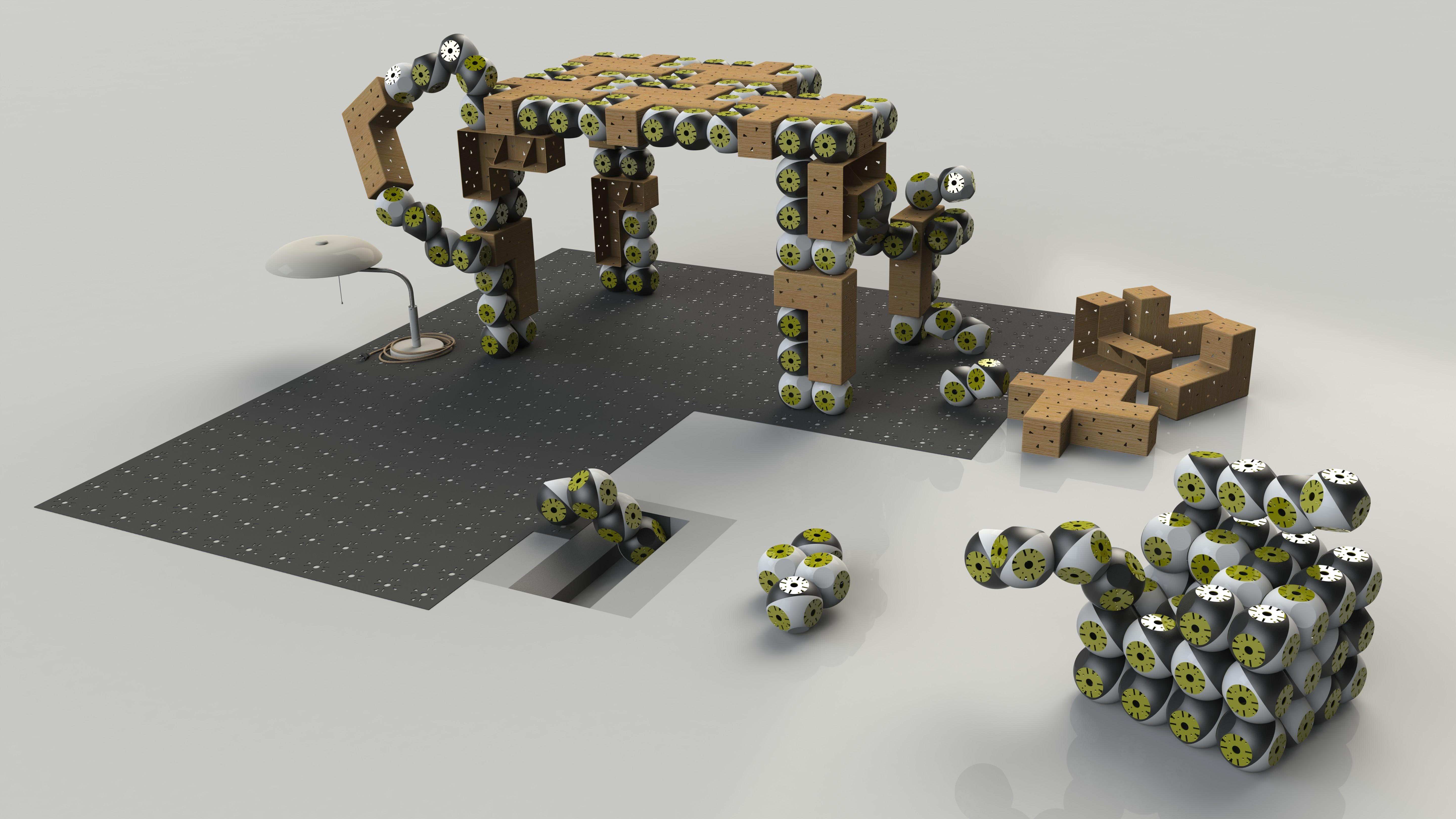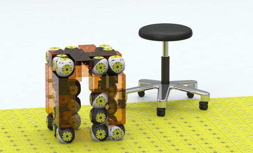 它的设计非常流畅和高效;每个Roombot都有四个马达和两个相互连接的球体(现在你明白“滚出去”的笑话了吗?)它们与其他Roombots合作,要么将现有的家具进行更好的配置,要么将它们简单地连接在一起,为你制作一把椅子或一张桌子或任何你想要的家具。你叫他们保持的任何形状;当它们相互连接或与类似乐高的被动家具元件连接时,您的意愿就会得到满足。一旦特定的家具停止使用,你可以命令这些机器人拆卸,要么变成新的东西,要么滚回它们的盒子里。