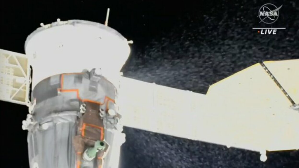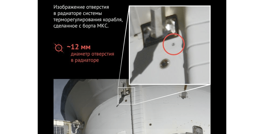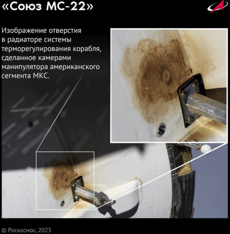 微小陨石或一小块轨道碎片必须击中飞船造成外部影响的进展。俄罗斯宇航局共同进步的快照车辆位置的影响。当这张图片与联盟号MS-22车辆的照片相比,受损的部分似乎没有什么共同点: