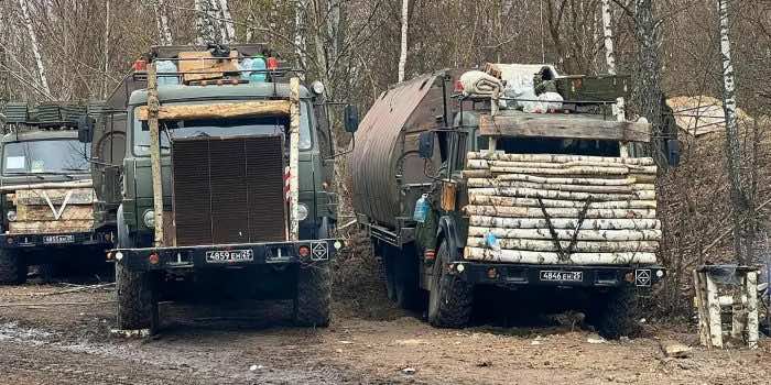 俄罗斯卡车驶出的tweet包括照片与许多日志小心地放在盘子面前捍卫他们靠近攻击。独特的“V”的标志,与俄罗斯汽车在欧元区刻在木头。日志显然是用于汽车的发动机免受炮火和防止燃烧和故障。卡车被宣称是运输PMP浮桥部分,是最有可能用来构造一个人行桥在普里皮亚季河白俄罗斯一侧的放射性疏散区。除了汽油卡车,组件被认为是重要的大宗商品和乌克兰军队的目标。