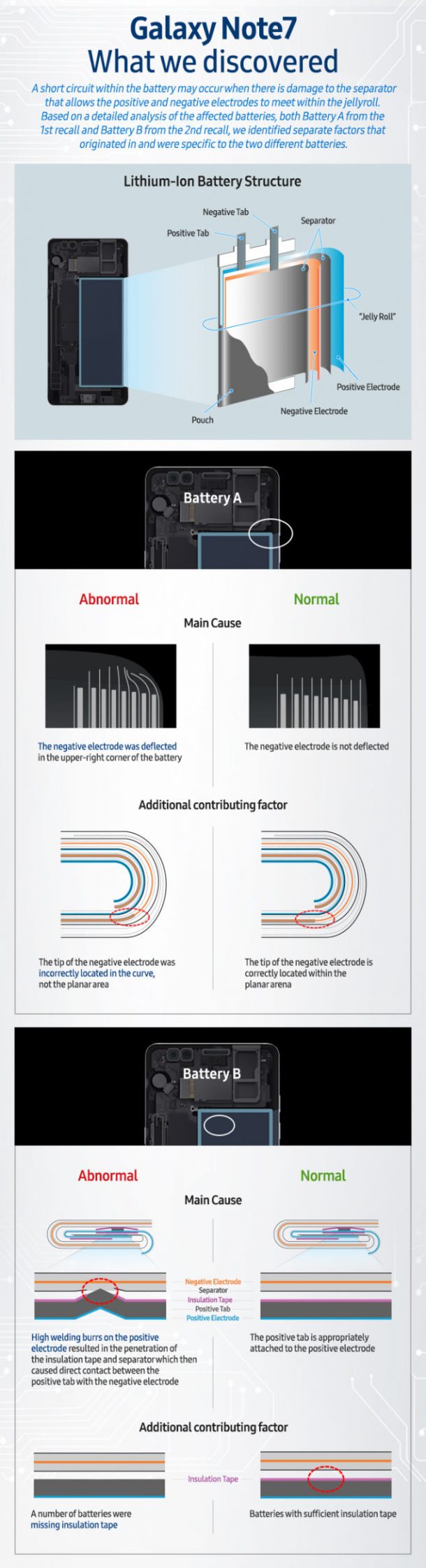 Exponent,UL和TUV Rheinland的报告指出,由于电池A在右上角的畸形而发生了问题。这种畸形导致电池内部的电极在升高的温度上弯曲和燃烧。该报告还将责任归咎于电池本身太大,无法“容纳电极组件”。