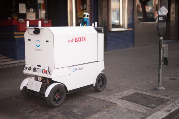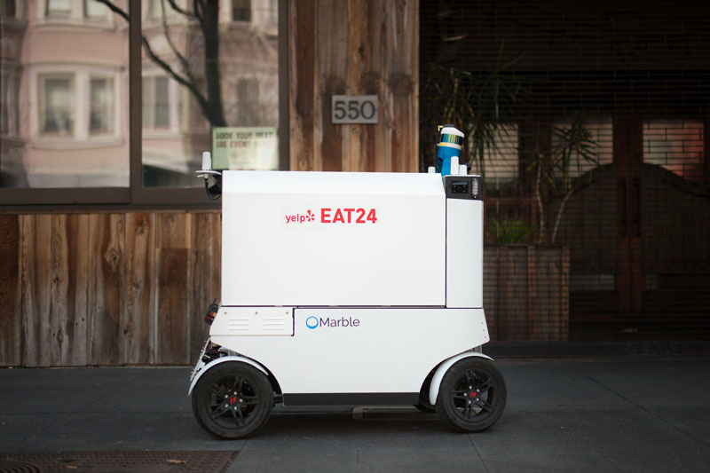 Yelp的Eat24食品交付计划和大理石一起启动了旧金山的机器人食品交付计划。机器人将取代送货人员,滚动到餐厅,拿起食物包并将其交付到客户的位置。客户将在开放机器人的货物区域之前收到一个PIN。