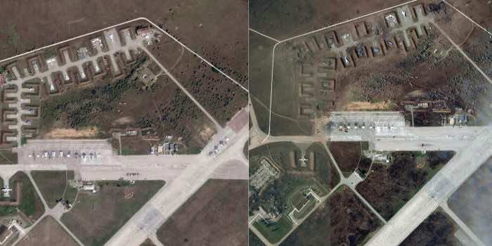 地球卫星图像获得的战场已经从实验室俄罗斯日本米酒的空军基地被占领的克里米亚半岛经过昨天的爆炸。