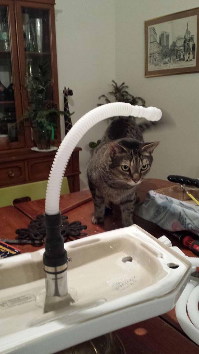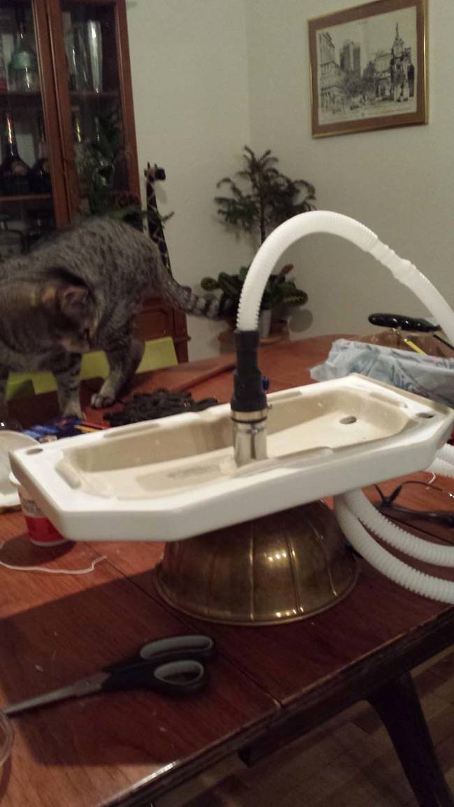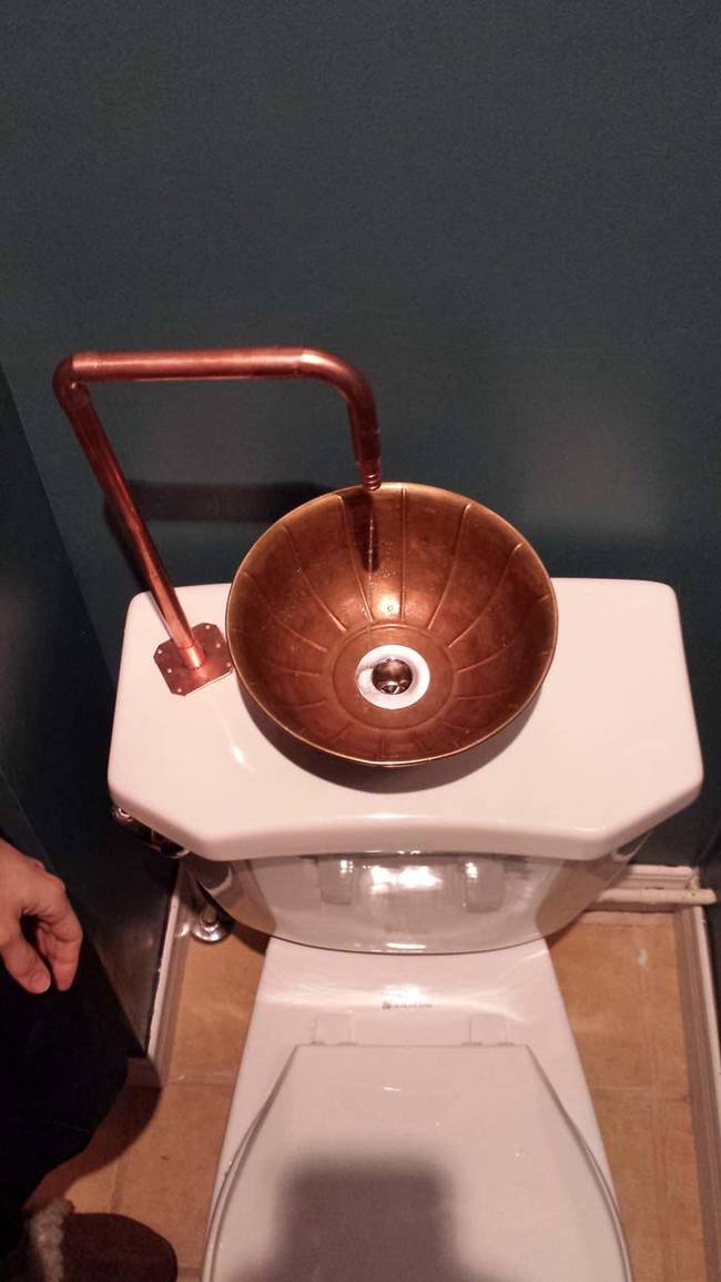在商店中发现了用作盆地的碗,并挖了一个孔将其连接到坦克盖上。这样,将洗碗机软管连接到排水组件上。