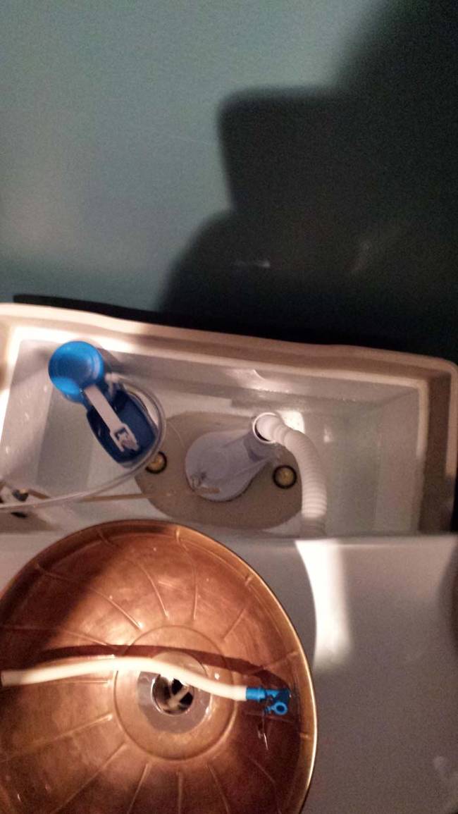 这实际上就是水箱内部的样子。蓝色管将水带到喷口而不是马桶罐中。您看到的洗碗机软管将灰水送到马桶罐中,以便将其冲洗。