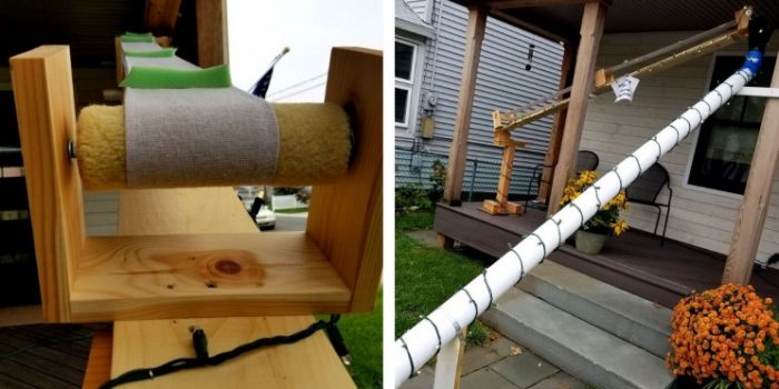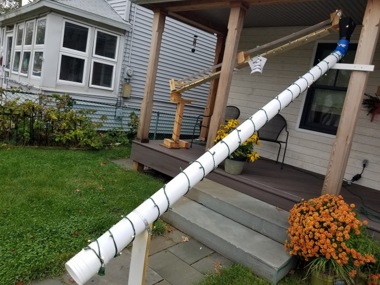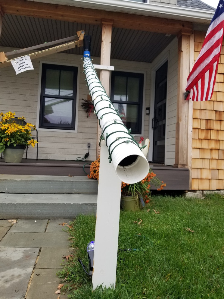 皮带由手持电钻供电。一旦到达顶部,零食就会被喂入溜槽。他花了两个星期的时间来建造整个过程。