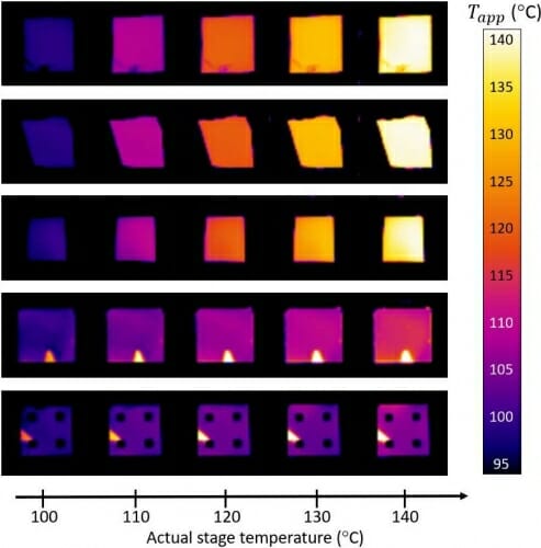 研究之后的实验基于两个样品,两块蓝宝石,涂了和没有涂涂层。两者的一侧都与高温表面接触。之后在红外摄像机前拍摄,观察温度变化趋势。没有涂层的那颗有明显的渐变,从深蓝色到粉色、红色、橙色和几乎白色。虽然好于预期,但另一个保持了它的一致性。