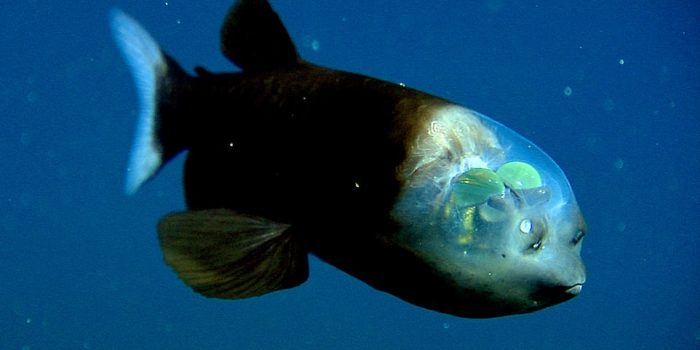 科学家们获得了一只带有球茎,半透明的头部和绿色球形眼睛的鱼的镜头,这些眼睛像额头那样,在加利福尼亚海岸附近的蒙特雷湾表面下方数千英尺。