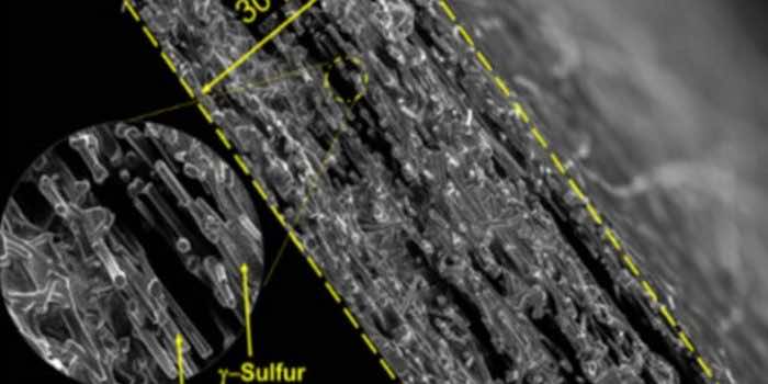 科学家试图将碳纳米纤维网格中的硫限制在使用称为蒸气处置的技术中,以防止危险的化学反应。它变成了一种称为单斜γ相硫的东西,这是该元素的略有变化形式。这种硫的化学阶段仅在实验室的高温下或在自然界中的油井中观察到。