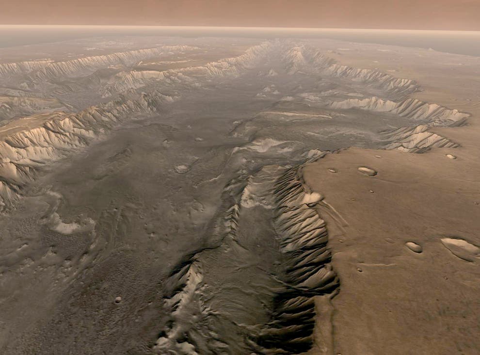 欧洲航天局的ExoMars卫星在水手谷火星峡谷系统下发现了大量水沉积物的证据,水手谷是太阳系中最大的峡谷之一,大约是亚利桑那州大峡谷的十倍长。