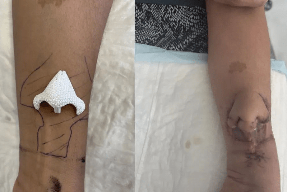 比利时的外科医生与临床团队合作医疗设备制造商CERHUM开发一种生物材料,nose-shaped结构。这是然后植入到和促进病人的胳膊上,一旦准备好了,这是将近通过显微外科吻合。